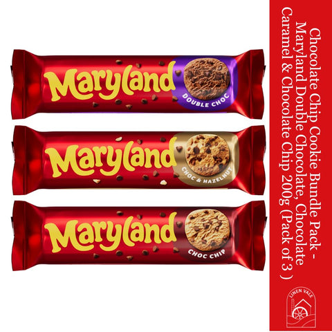 Indulge in the ultimate cookie experience with our Chocolate Chip Cookie Bundle Pack, featuring three delectable flavors from the beloved Maryland brand. This delightful assortment includes Maryland Double Chocolate Cookies, Maryland Chocolate Caramel Cookies, and Maryland Chocolate Chip Cookies, each packaged in a generous 200g pack. Dive into the rich, chocolatey paradise of the Double Chocolate Cookies, where velvety chocolate dough meets an abundance of chocolate chips for a double dose of cocoa goodness. Experience the heavenly combination of chocolate and caramel with the Chocolate Caramel Cookies, infused with luscious caramel pieces that melt in your mouth alongside rich chocolate chips. Enjoy the timeless classic, Maryland's Chocolate Chip Cookies, which are crisp, buttery, and loaded with premium chocolate chips for a perfect bite every time. Ideal for sharing with family and friends or savoring on your own, this bundle offers a variety of flavors to satisfy any cookie craving. Perfect for any occasion, whether hosting a tea party, packing lunchbox treats, or gifting to a chocolate lover, our Chocolate Chip Cookie Bundle Pack is the ideal choice. Treat yourself and your loved ones to this trio of deliciousness and enjoy pure cookie bliss.