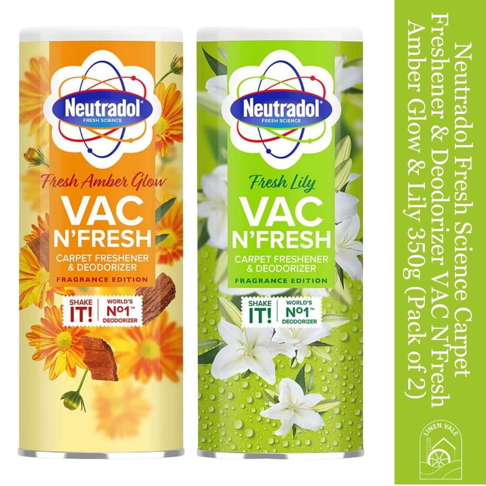 Experience the ultimate freshness with Neutradol Fresh Science Carpet Freshener & Deodorizer VAC N'Fresh in the exquisite Amber Glow & Lily scent. This convenient pack of two 350g bottles ensures your carpets and rugs stay beautifully fresh while effectively eliminating unwanted odors. Utilizing Neutradol's advanced Fresh Science technology, this carpet freshener neutralizes unpleasant smells, replacing them with a luxurious and long-lasting fragrance that infuses your home with elegance and warmth. Easy to use, simply sprinkle the carpet freshener evenly over your carpets or rugs before vacuuming, and enjoy instant, enduring freshness. Designed to be safe for use around pets and children, Neutradol VAC N'Fresh is the ideal choice for every household. Trust in Neutradol, a name renowned for scientifically formulated products that outlast and outperform ordinary deodorizers. Elevate your home cleaning routine with the Neutradol Fresh Science Carpet Freshener & Deodorizer VAC N'Fresh Amber Glow & Lily pack of 2, and transform your living spaces into fragrant havens of comfort and cleanliness.